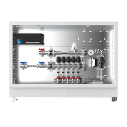 strawa Comfort Kompakt-Regelstation FBR-63-HT1-H-WMZ-C69-E 6 Hkr.,BxHxT: 1050 x 775 x 122 mm, Festwert 20-50°C m. Pumpe, 1x HT-Abgang, horz. AG m. WMZ, Verteiler m. DFA 0-3 l/min+THV M30x1,5, vorm. Stellantr., CUP-Schrank RAL 9016