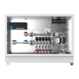 strawa Comfort Kompakt-Mischstation FBM-63-HT1-H-W1-WMZ-C69-E 8 Hkr.,BxHxT: 1200 x 775 x 122 mm, Mischg. m 3P SM m. Pum, 1x HT-Abg, horz. AG m. WMZ, Verteiler m. DFA 0-3+THV M30x1,5, vorm. Stellantr., WZ-TW kalt, CUP-Schrank RAL9016
