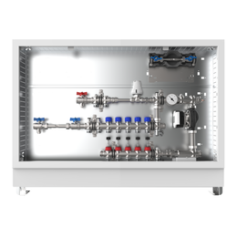strawa Comfort Kompakt-Regelstation FBR-63-HT2-H-W1-WMZ-C69-E 6 Hkr.,BxHxT: 1050x775x122 mm, Festwert 20-50°C m. Pum, 2x HT-Abg, horz. AG m. WMZ, Verteiler m. DFA 0-3+THV M30x1,5, vorm. Stellantr., WZ-TW kalt, CUP-Schrank RAL9016