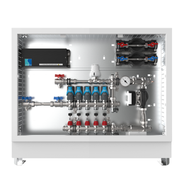 strawa Comfort Regelstation FBR-18-H-W2-WMZ-C69 5 Hkr.,BxHxT: 900x775x122 mm, Festwert 20-50°C mit Pumpe, horz. AG m. WMZ, Verteiler m. DFA min/max + THV für EGO, Wasserzählerstr. TW kalt u. warm, Comfort-UP-Schrank m. Frontbl. RAL 9016
