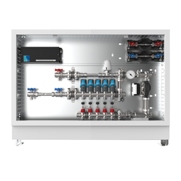 strawa Comfort Kompakt-Regelstation FBR-18-HT1-H-W2-WMZ-C69 5 Hkr.,BxHxT: 1050 x 775 x 122 mm, Festwert 20-50°C m. Pumpe, 1x HT-Abgang, horz. AG m. WMZ, Verteiler m. DFA min/max + THV f EGO, WZ-Strecke TW kalt+warm, CUP-Schrank m. Frontbl. RAL 9016