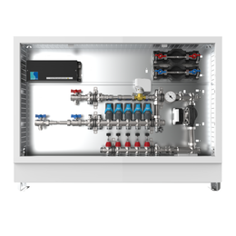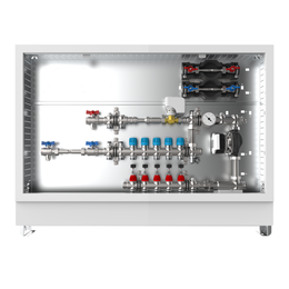 strawa Comfort Kompakt-Mischstation FBM-18-HT2-H-W2-WMZ-C69 5 Hkr.,BxHxT: 1050 x 775 x 122 mm, Mischg. m 3P SM m. Pumpe, 2x HT-Abgang, horz. AG m. WMZ, Verteiler m. DFA min/max + THV f EGO, WZ-Strecke TW kalt+warm, CUP-Schrank m. Frontbl. RAL 9016