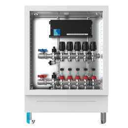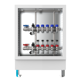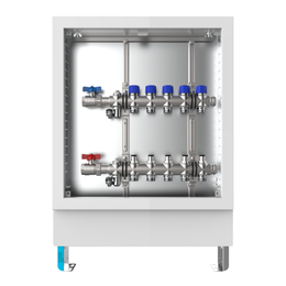 strawa FB-Anschlussstation H 63h-X 6 Hkr.,BxHxT: 600 x 725 x 92 mm, horiz. AG o. WMZ, Verteiler mit DFA 0-3 l/min + THV M30x1,5, vorm. Stellantr.+Klemml. m. Vorverdraht., Standard-UP-Schrank mit Frontblende in RAL 9016