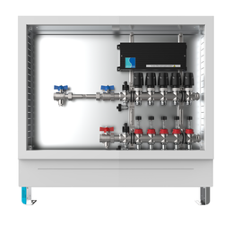 strawa FB-Anschlussstation H 63h-WMZ-X 5 Hkr.,BxHxT: 750 x 725 x 92 mm, horiz. AG. m. WMZ, Verteiler mit DFA 0-3 l/min + THV M30x1,5, m. vorm. Stellantrieb. und Klemmleiste m. Vorverdraht., Standard-UP-Schrank mit Frontblende in RAL 9016