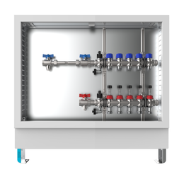 strawa FB-Anschlussstation H 63h-WMZ-X 11 Hkr.,BxHxT: 1050 x 725 x 92 mm, horiz. AG. m. WMZ, Verteiler mit DFA 0-3 l/min + THV M30x1,5, m. vorm. Stellantrieb. und Klemmleiste m. Vorverdraht., Standard-UP-Schrank mit Frontblende in RAL 9016