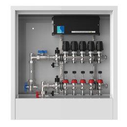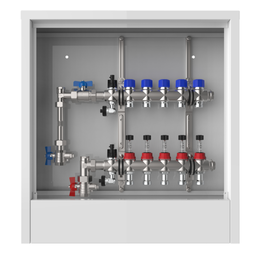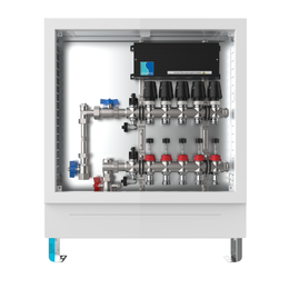 strawa FB-Anschlussstation H 63-WMZ-80-X 5 Hkr.,BxHxT: 600 x 725 x 92 mm, vert. AG. m. WMZ, Verteiler mit DFA 0-3 l/min + THV M30x1,5, vorm. Stellantr.+Klemml. m. Vorverdraht., Standard-UP-Schrank mit Frontblende in RAL 9016