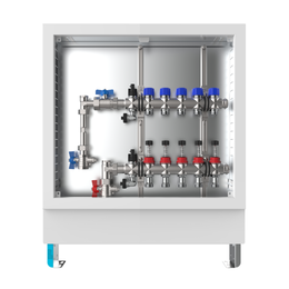 strawa FB-Anschlussstation H 63-WMZ-X 7 Hkr.,BxHxT: 750 x 725 x 122 mm, vert. AG. m. WMZ, Verteiler mit DFA 0-3 l/min + THV M30x1,5, vorm. Stellantr.+Klemml. m. Vorverdraht., Standard-UP-Schrank mit Frontblende in RAL 9016
