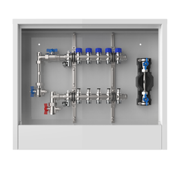 strawa FB-Anschlussstation H 53-W1-WMZ-80 6 Hkr.,BxHxT: 750 x 725 x 92 mm, vert. AG m. WMZ, Verteiler mit Regulierventil + THV M30x1,5, Wasserzählerstr. TW kalt, Standard-UP-Schrank mit Frontblende in RAL 9016
