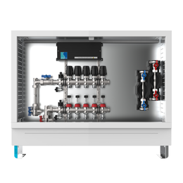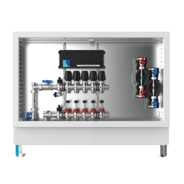 strawa FB-Anschlussstation H 63-W2-WMZ-AP-X 8 Hkr.,BxHxT: 1032x620x125 mm, vert. AG. m. WMZ, Verteiler mit DFA 0-3 l/min + THV M30x1,5, vorm. Stellantr. + Klemml. m. Vorverdraht., Wasserzählerstr. TW kalt u. warm, Standard-AP-Schrank in RAL 9016
