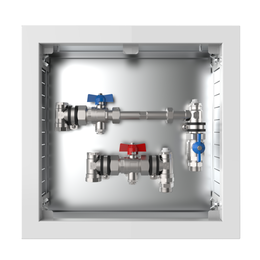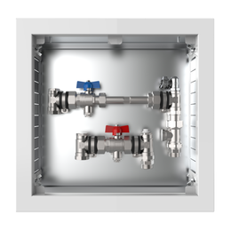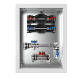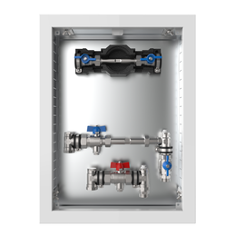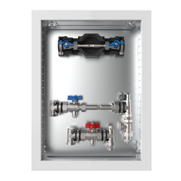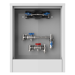 strawa Anschlussstation AS 16-W2-WMZ,BxHxT: 410 x 546 x 92 mm, 1 Wohnungsanschluss, verti. AG m. WMZ, mit Regulierventil, mit Wasserzählerverrohrung Trinkwasser kalt und warm, Standard-UP-Wandschrank mit Frontblende in RAL 9016