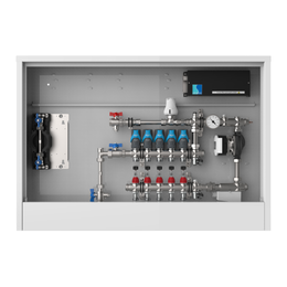 strawa Comfort Regelstation FBR-18-V-W1-WMZ-CA-EGO 7 Hkr.,BxHxT: 1182x710x125 mm, Festwert 20-50°C mit Pumpe, vert. AG m. WMZ, Verteiler mit DFA min/max+THV f. EGO, vorm. EGO-Regel.+Klemml. m. Vorverdr., WZ-Strecke TW kalt, CAP-Schrank in RAL 9016