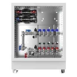 strawa Comfort Anschlussstation FBH-63-V-W2-WMZ-CA 3 Hkr.,BxHxT: 732 x 710 x 125 mm, vert. AG. m. WMZ, Verteiler mit DFA min/max + THV für EGO, Wasserzählerstr. TW kalt, Comfort-AP-Schrank in RAL 9016