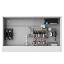 strawa Comfort Mischstation FBM-63-V-W2-WMZ-CA-E 5 Hkr.,BxHxT: 1182x710x125 mm, Mischg. m 3P SM m. Pumpe, vert. AG m. WMZ, Verteiler mit DFA 0-3 l/min+THV M30x1,5, , vorm. Stellantr.+Klemml. m. Vorverdr., WZ-Strecke TW kalt+warm, CAP-Schrank RAL9016