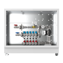strawa Comfort Kompakt-Mischstation FBM-18-HT2-H-WMZ-C69 5 Hkr.,BxHxT: 1050 x 775 x 122 mm, Mischg. m 3P SM mit Pumpe, 2x Hochtemperaturabgang, horz. AG m. WMZ, Verteiler m. DFA min/max + THV für EGO, Comfort-UP-Schrank m. Frontbl. RAL 9016