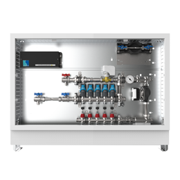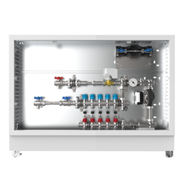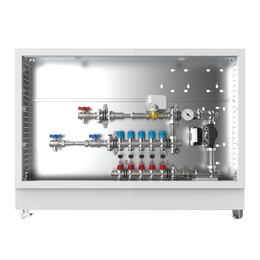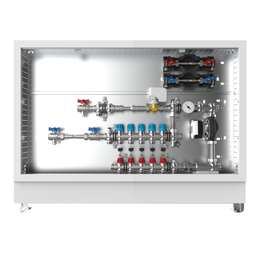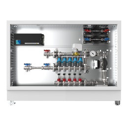 strawa Comfort Kompakt-Mischstation FBM-18-HT1-H-W1-WMZ-C69-EGO 4 Hkr.,BxHxT: 900 x 775 x 122 mm, Mischg. m 3P SM m Pum, 1x HT-Abg, horz. AG m. WMZ, Verteiler m. DFA min/max+THV für EGO, vorm. EGO-Regelantr., WZ-TW kalt, CUP-Schrank RAL9016