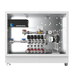 strawa Comfort Mischstation FBM-63-V-CA 5 Hkr.,BxHxT: 732 x 710 x 125 mm, Mischg. m 3P SM mit Pumpe, vert. AG o. WMZ, Verteiler mit DFA 0-3 l/min + THV M30x1,5, Comfort-AP-Schrank in RAL 9016