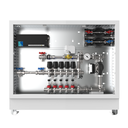 strawa Comfort Mischstation FBM-63-H-W1-WMZ-C69-E 11 Hkr.,BxHxT: 1200 x 775 x 122 mm, Mischg. m 3P SM m. Pumpe, hor. AG m. WMZ, Verteil m. DFA 0-3 l/min+THV M30x1,5, vorm. Stellantr.+Klemml. m. Vorverdr, WZ-Strecke TW kalt, CUP-Schrank m. Frontbl. RAL9016